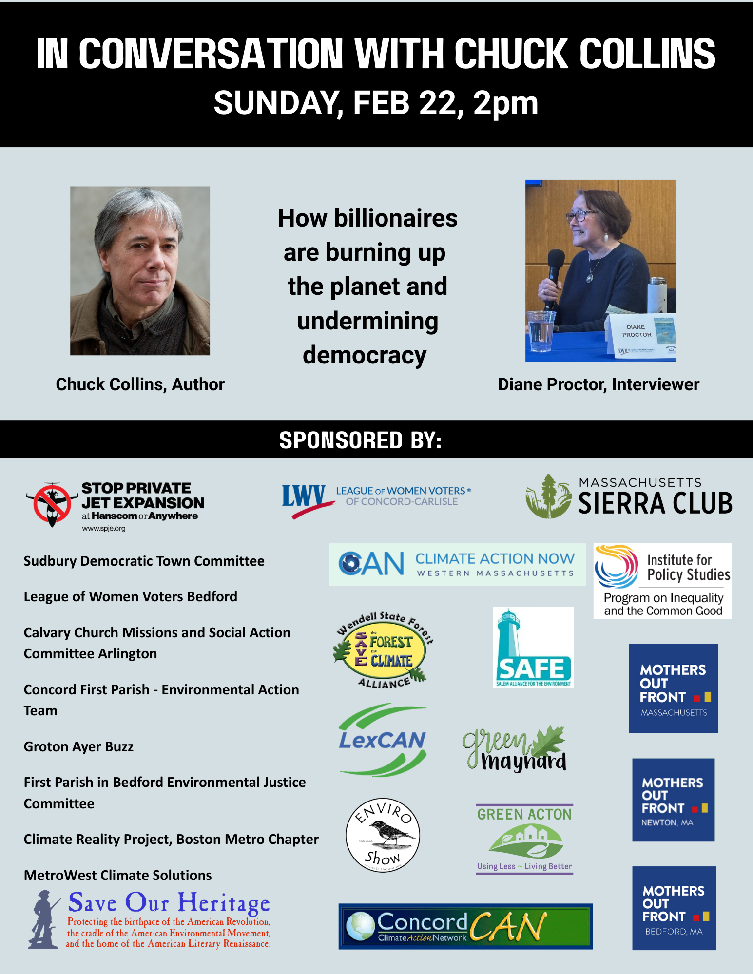 Diane Proctor’s interview “In Conversation with Chuck Collins” focused on how billionaires are burning up the planet and undermining democracy, the subject of Collins’ recent book Burned by Billionaires, which includes remarks about the proposed private jet expansion at Hanscom. Over 300 people registered for this hybrid event and nearly 200 attended.