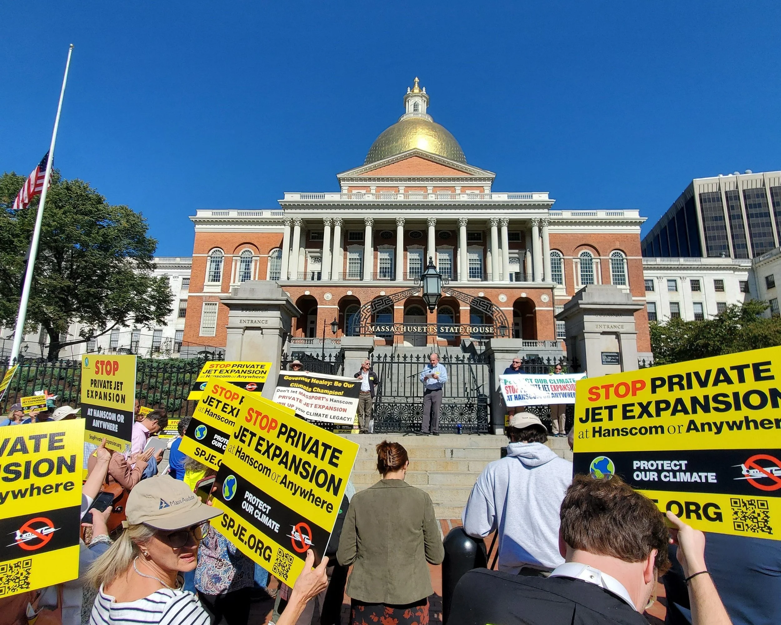 Over 240 people rallied at the State House to deliver more than 10,000 petition signatures urging Governor Healey to stop the reckless private jet hangar expansion at Hanscom or anywhere. Learn more here