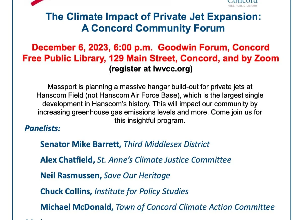 Sponsored by: Stop Private Jet Expansion at Hanscom or Anywhere, League of Women Voters of Concord-Carlisle, Sierra Club Massachusetts